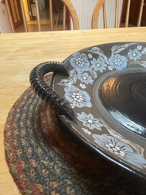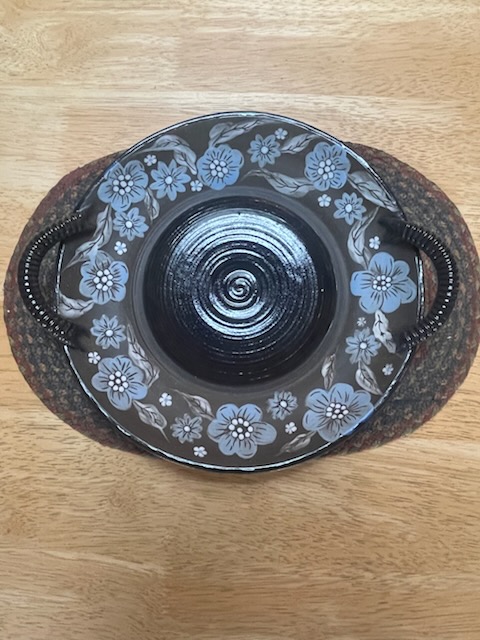 A pale blue and white slip has been used to for the flowers on the edges of the bowl. A translucent cobalt glaze is used on the texture handles, the center and the outside edges of the bowl.