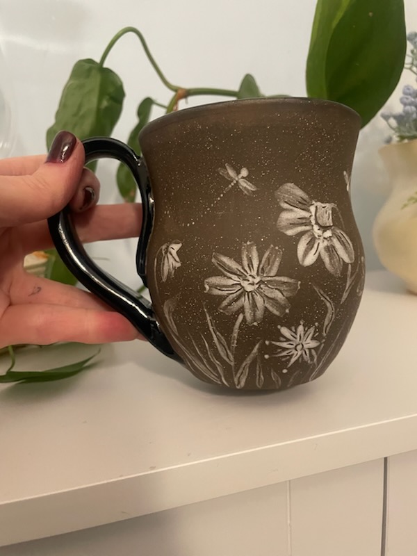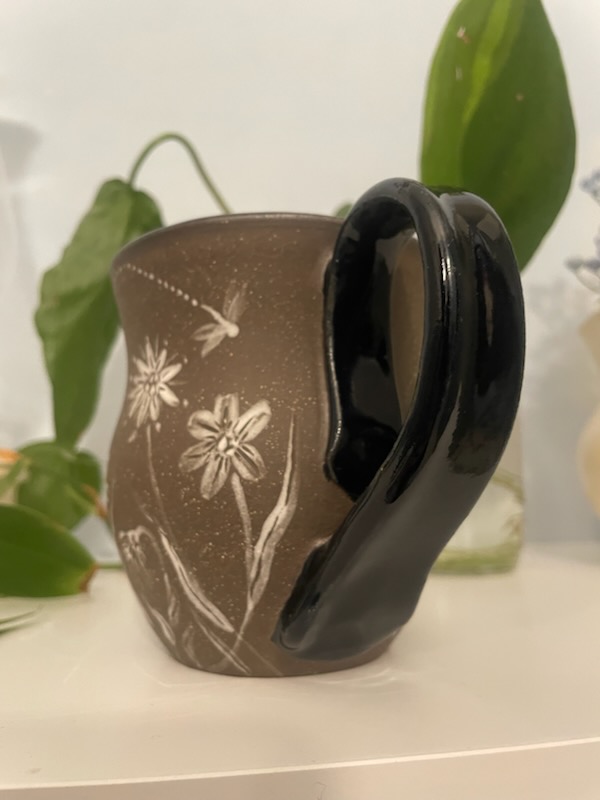 hand painted using white slip with hand carving done on black clay. Blue sapphire glaze used on handle and inside.